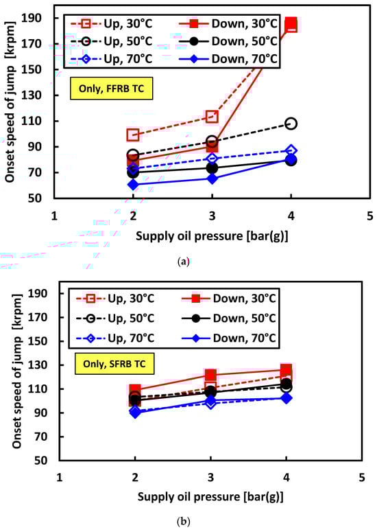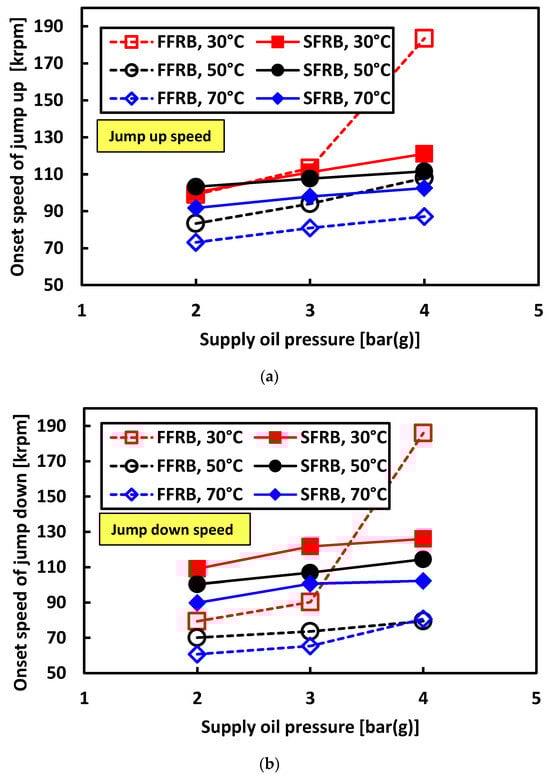 Jump-up and jump-down speeds versus oil pressure at 30 °C oil temperature. (a) FFRB and SFRB comparison for jump-up speeds. (b) Corresponding jump-down speed trends.