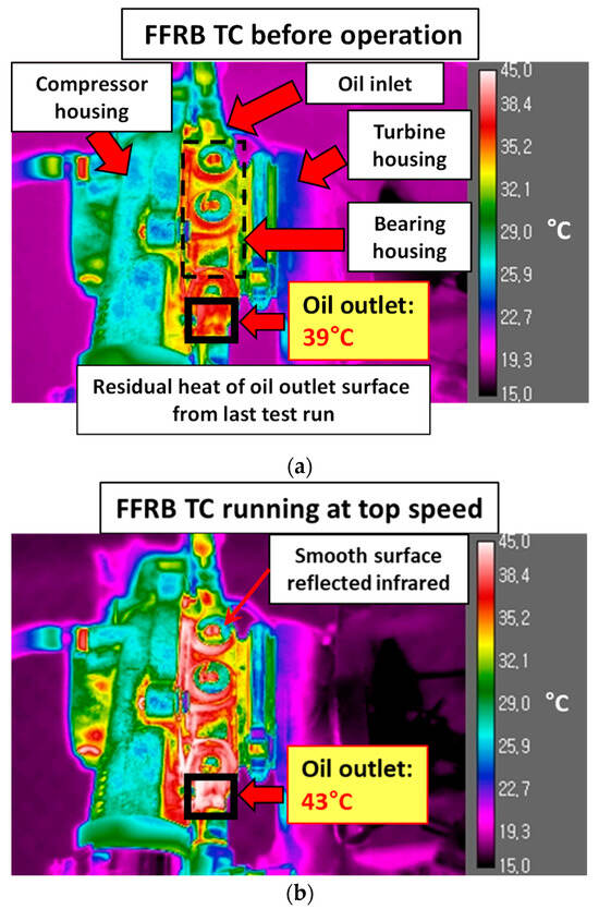IR thermal images of the FFRB-supported turbocharger under 70 °C, 2 bar (g) oil condition. (a) Before operation. (b) At the top speed.