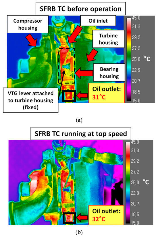 IR thermal images of the SFRB-supported turbocharger under 30 °C, 2 bar (g). (a) Before rotation. (b) At full speed.