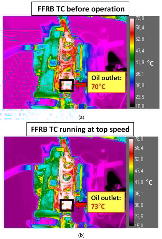 In addition to vibrational analysis, thermal behavior was assessed using IR imaging and oil outlet temperature measurements. These diagnostics offered critical insight into frictional power loss, energy dissipation, and the relative thermal efficiency of the bearing systems under high-speed operation.