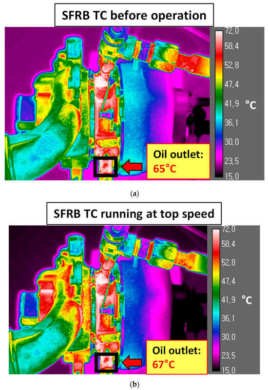 IR thermal images of the SFRB-supported turbocharger under 70 °C, 2 bar (g) oil condition. (a) Before operation. (b) At the top speed.