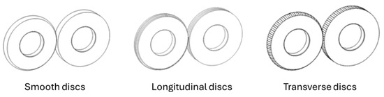For this study, three pairs of discs were used: one smooth pair (Sq ≈ 0.07 µm), corresponding to superfinished surfaces, and two rough pairs with controlled surface finishes exhibiting similar roughness levels (Sq ≈ 0.5 µm), but differing in roughness orientation, one transverse and one aligned with the sliding direction (Figure 2).