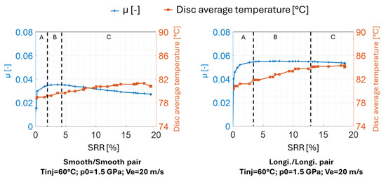 Figure 3 shows the evolution of the friction coefficient (in blue) and the average temperature of the two tested discs (in red) as a function of the SRR for both smooth/smooth and longitudinal/longitudinal pairs (Operating conditions: Tinj = 60 °C; p0 = 1.5 GPa; Ve = 20 m/s). The measurement procedure of disc bulk temperatures was described by Isaac [24]. A traction curve consists of three distinct regions [32]: