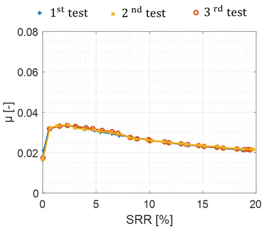 Each test is performed at least two times to ensure its repeatability. For example, Figure 4 shows the three performed tests with the smooth/smooth pair under the following operating conditions: Tinj = 60 °C, p0 = 1.5 GPa, Ve = 30 m/s. For these tests, the mean absolute deviation on the friction coefficient is , while the maximum absolute deviation is .