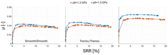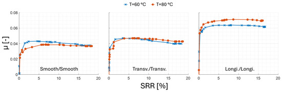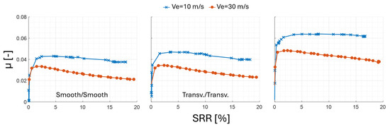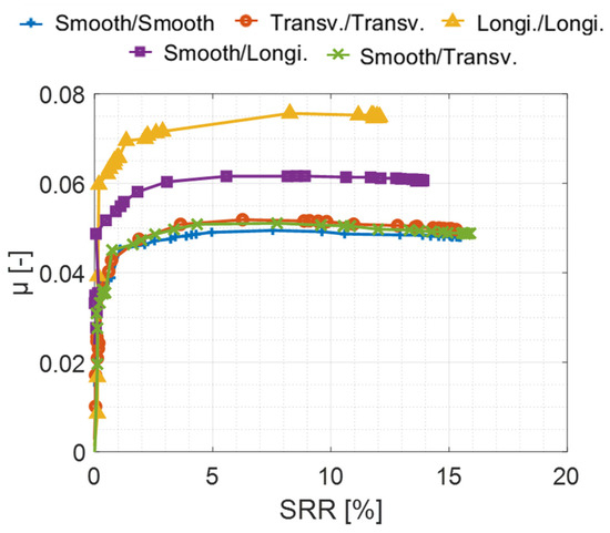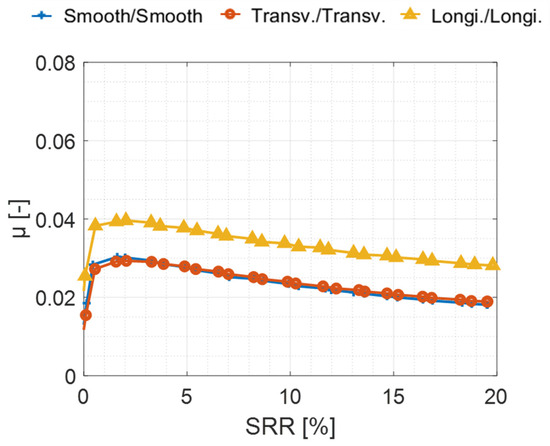 The friction coefficient of the longitudinal/longitudinal pair is significantly higher than that of the transverse/transverse pair (with a difference of 0.025 for an SRR of 10%), even though both pairs show similar ranges of values (Table 7). The smooth/transverse pair produces less friction than the smooth/longitudinal one, which supports the observations reported by Jeng [40]. Furthermore, the friction coefficient of the smooth/longitudinal combination exceeds that of the transverse/transverse pair, despite its being lower. These findings suggest that, for a given roughness level, longitudinal roughness tends to generate more friction than transverse.