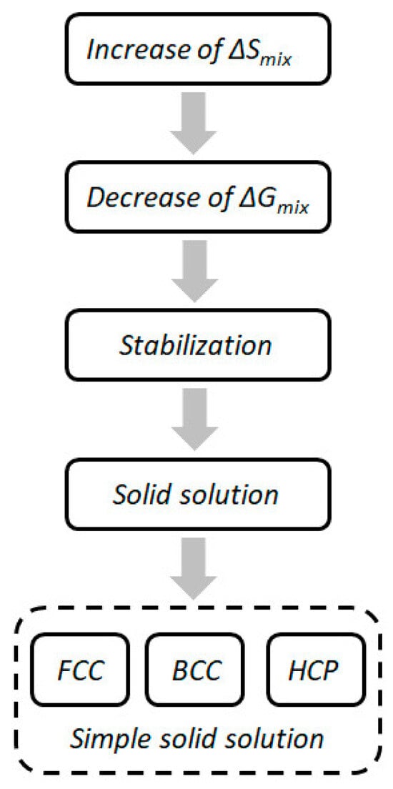 In traditional alloys, due to the scarcity of main elements, the probability of forming intermetallic compounds or brittle phases is relatively high. The presence of these phases often reduces the toughness and overall performance of the alloy. In high-entropy alloys, when five or more main elements are uniformly mixed, the high-entropy effect acts like a “structural stabilizer”, which makes the alloy system tend to form simple solid solution structures with lower free energy, such as face-centered cubic FCC, body-centered cubic BCC, and closely arranged hexagonal HCP. This is because in a high-entropy state, the energy barriers that need to be overcome to form complex intermetallic compounds increase significantly, and alloys are more likely to exist in the form of uniform solid solutions [,]. The high-entropy effect has been confirmed from many aspects [,,,,]. The schematic diagram of the high-entropy effect promoting the formation of solid solutions is shown in Figure 1. Here, ΔGmix represents the change in Gibbs free energy, and ΔSmix represents the change in the mixed entropy.