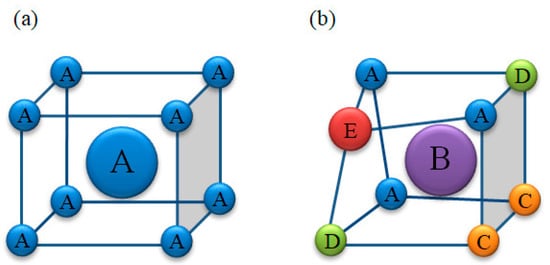 The initial definition of high-entropy alloys was based on the mixed entropy value of the alloys. In statistical thermodynamics, entropy is a thermodynamic property related to the degree of system chaos and is a measure of the degree of system chaos. Mixed entropy is the change in the entropy value of the system caused by the different configurations of atoms of different principal elements being mixed with each other []. The mixed entropy reaches its maximum value when there is no concentration gradient in the alloy system, which is known as the system reaching equilibrium. It is generally believed that if the influence of other configurations on the entropy value of the alloy system is not considered, the atomic arrangement configuration has the greatest impact on the entropy value of the multi-principal high-entropy alloy system. Therefore, the mixed entropy caused by atomic arrangement is the main contributor to the entropy value change of high-entropy alloy systems [].
