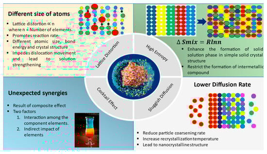 The above four major effects of high-entropy alloys are interdependent and synergistic, jointly shaping their excellent comprehensive performance. Figure 4 describes the lattice structure that leads to the four major effects of high-entropy alloys []. The high-entropy effect, as the cornerstone of structural stability, promotes the formation of a uniform solid solution in the alloy, laying the foundation for the exertion of other effects. The lattice distortion effect significantly enhances the strength and hardness of the alloy by disrupting the lattice structure. The hysteresis diffusion effect significantly reduces the atomic diffusion rate through complex interactions among multiple components, effectively enhancing the high-temperature stability, corrosion resistance and wear resistance of the alloy. The cocktail effect breaks through the linear superposition limitation of traditional alloy properties through the synergistic complementarity of multiple alloying elements, achieving an optimized balance of various properties such as strength, toughness, and oxidation resistance.