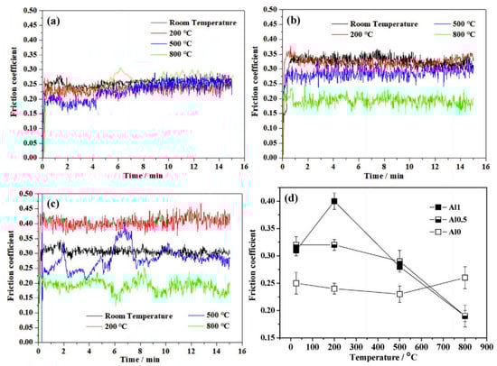 Friction coefficient curves of (a) Al0, (b) Al0.5, (c) Al1 alloys, (d) average friction coefficient [].