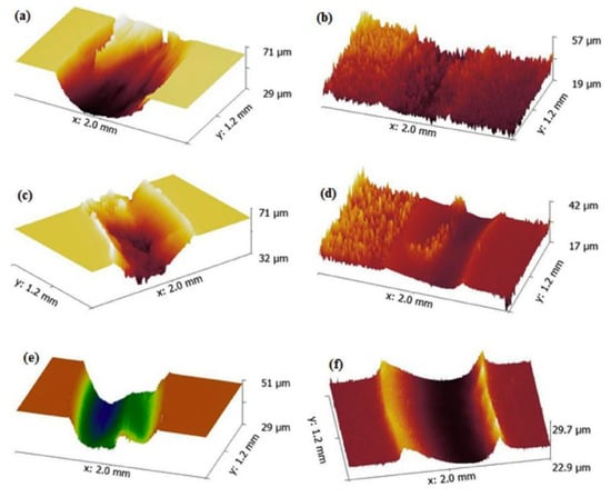Three-dimensional morphologies of the worn surfaces of (a,b) Al0, (c,d) Al0.5 and (e,f) Al1 alloys: (a,c,e) room temperature and (b,d,f) 800 °C [].
