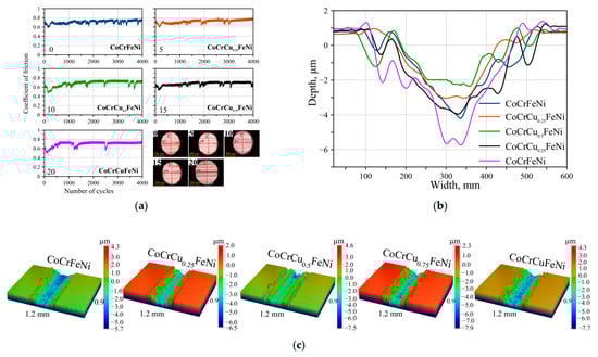 Cu, as a relatively common transition metal element, can also affect the performance of high-entropy alloys to a certain extent. Mukanov et al. [] studied the influence of the introduction of the Cu element on high-entropy alloys. As shown in Figure 7, Figure 7a presents the dynamic variation of the friction coefficient with the number of cycles of CoCrCuxFeNi alloys with different Cu contents during the friction test. Figure 7b compares the depth and width of the wear trajectories of alloys with different Cu contents. It can be seen that the results show that the wear grooves of CoCrCu0.25FeNi (5 at. % Cu) are the shallowest. Figure 7c presents the microscopic characteristics of the worn surface from a 3D perspective. The oxide layer on the surface of the sample with a low Cu content (≤5 at. %) is continuous, with only shallow grooves existing. Verma et al. [] also investigated the influence of Cu on the wear resistance of CoCrFeNi and found that after adding Cu to CoCrFeNi, the wear rate of the obtained CoCrFeNiCu decreased at both room temperature and high temperature, and the hardness of the alloy increased.