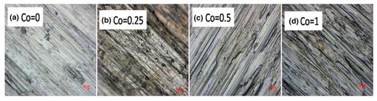Shu et al. [] investigated the use of Co instead of Fe to enhance the amorphous formation ability of laser cladding FeCoCrBNiSi high-entropy alloy coatings. They found that an increase in the iron–cobalt ratio would reduce the proportion of amorphous phases in the coating, intensify oxidative wear at high temperatures, and lower the high-temperature wear resistance of the alloy. Kumar et al. [] investigated the frictional behavior of the Al0.4FeCrNiCox high-entropy alloy (with x being 0, 0.25, 0.5, and 1.0, respectively). As shown in Figure 8, it is the optical microscopic image of the worn surface of the Al0.4FeCrNiCox (x = 0, 0.25, 0.5, 1.0 mol) high-entropy alloy under a sliding speed of 2 m/s, a sliding distance of 1000 m and a normal load of 10 N. Here, the influence of Co content on the morphology of the worn surface can be intuitively reflected. In Figure 8a, there is no Co addition. At this time, shallow scratches and micro-grooves parallel to the sliding direction can be seen on the worn surface. There is a small amount of plastic deformation of the material locally, but the overall wear marks are uniform, with no obvious oxide layer peeling or deep damage areas. In Figure 8b, when a small amount of Co is added, the scratch depth increases, local deep grooves appear, and material flow traces can be seen in some areas. The roughness of the worn surface is significantly higher than that in Figure 8a. When the Co content is further increased, as shown in Figure 8c, the worn surface presents irregular grooves and microcracks at this time. In some areas, material spalling pits appear, and the scratch directions are disordered, showing obvious fatigue wear characteristics. In Figure 8d, a large amount of Co addition leads to deep grooves, severe plastic deformation and large-scale spalling on the worn surface. Obvious material accumulation can be seen at the scratch edge, and the metal substrate is exposed in some local areas.