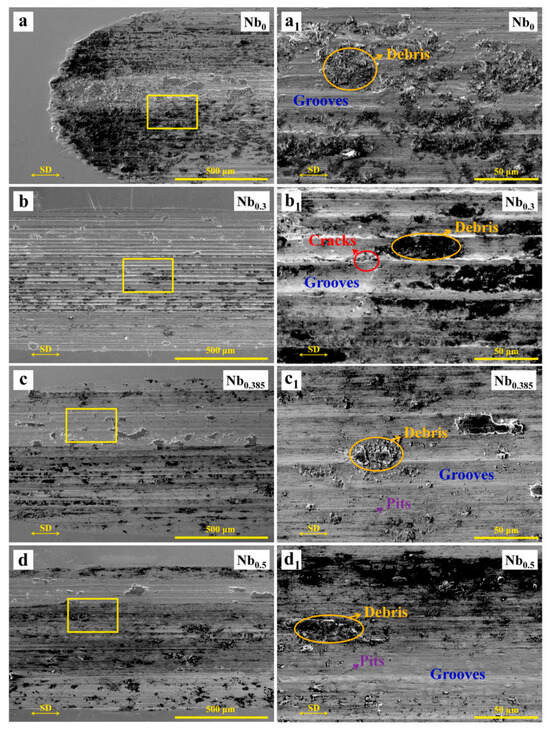 Refractory metal elements are also important elements that affect the phase formation and microstructure of high-entropy alloys. Adding Nb element to high-entropy alloys can usually improve their wear resistance. Cheng et al. [] prepared CoNiCuFeCr and CoNiCuFeCrNb coatings by plasma transfer arc melting and found that under the same wear test conditions, the addition of Nb could improve the wear resistance of the coatings by approximately 1.5 times. The research results of Yu et al. [] indicated that Nb can enhance the hardness of CoCrFeNiNbx high-entropy alloy, making the wear at room temperature mainly abrasive wear. At a high temperature of 800 °C, due to the formation of a dense oxide layer, the wear rate is nearly zero. An increase in Nb content will intensify adhesive wear at 400 °C, and oxidative wear and mechanical wear above 600 °C will become the main mechanisms. Liu et al. [] pointed out that in the CoCrNiNbx medium-entropy alloys, Nb promotes the formation of the BCC phase, refines the grains and increases the hardness. When x is within the appropriate range, the friction coefficient of the alloy decreases and the wear rate also drops, enhancing the wear resistance of the alloy. Figure 9 presents the SEM image of the worn surface of Nbx. Among them, the a1–d1 image on the right is the enlarged image corresponding to the marked yellow square area in the a–d image on the left. In Figure 9a, when x = 0, that is, when Nb is not added, there are deep furrows and a large amount of adhered wear debris on the alloy surface, forming a hilly accumulation. The wear mechanism is mainly characterized by severe adhesive wear and plastic deformation. At this time, the hardness of the alloy is low, and the FCC phase is prone to plastic flow. When x = 0.385, as shown in Figure 9c, the worn surface is smooth at this time, with only shallow grooves and a small amount of oxide layer. The layered eutectic structure suppresses local plastic deformation and debris accumulation by evenly sharing frictional stress. When x = 0.5, as shown in Figure 9d, cracks, spalling pits and coarse wear debris appear on the surface at this time, and the wear mechanism changes to fatigue wear and abrasive wear. Excessive brittleness of the laves phase leads to the propagation of microcracks on the wear surface, and the rupture of the oxide film intensifies the material loss.