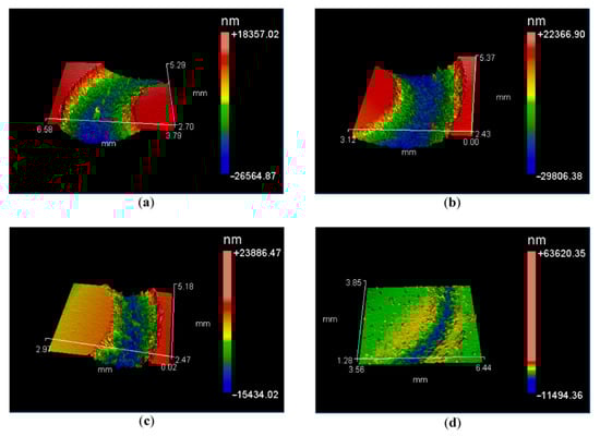 Surface profile of the worn surface at different temperatures: (a) room temperature; (b) 200 °C; (c) 400 °C; (d) 600 °C [].
