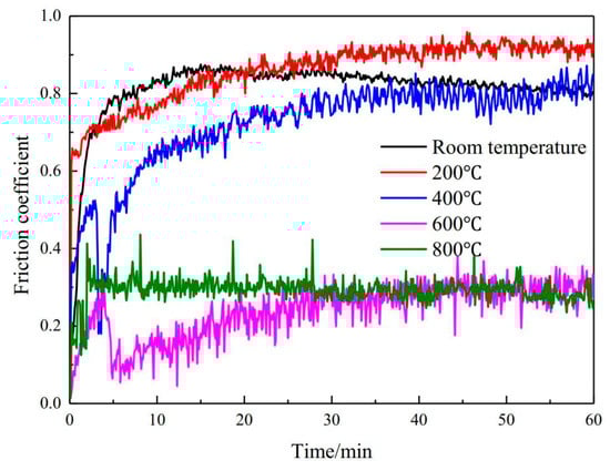 Jin et al. [] investigated the high-temperature performance of laser cladding FeNiCoAlCu high-entropy alloy coatings. Figure 12 reflects the influence of high temperature on the tribological properties of high-entropy alloys. The results show that the coefficient of friction is stable at 0.8–0.9 at room temperature, 200 °C and 400 °C. At 600 °C and 800 °C, the coefficient of friction significantly drops to around 0.3. This trend directly reflects the regulation of alloy friction behavior by high-temperature environments, promoting the formation of oxide films and significantly reducing the coefficient of friction. In addition, Du et al. [] also prepared an Al0.25CoCrFeNi high-entropy alloy and conducted friction tests within the temperature range of 20 °C to 600 °C. The results show that due to high-temperature softening, the wear rate increases with the rise in temperature. However, due to the formation of the oxide film and the decrease in adhesion as the temperature rises, the coefficient of friction also decreases with the increase in temperature.