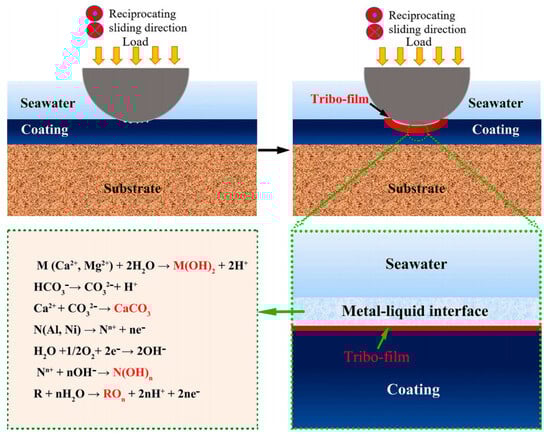 Most traditional alloys are prone to corrosion in seawater environments. Corrosion can deteriorate the worn surface and accelerate wear. Traditional corrosion-resistant alloys have relatively low hardness and strength, making it difficult to meet the requirements of wear resistance. Research has found that some metal elements, after corroding in seawater, can form self-lubricating oxides and hydroxides. Reference [] describes the influence of the Marine environment on the high-entropy alloy coating of AlCrFeNiW0.2 Ti0.5. The tribological properties of this coating are superior to those of Q235 steel and SUS304 stainless steel. The friction and wear of this coating are the least in seawater. This is because Ca2+, Mg2+ and other substances in seawater form a protective friction film containing CaCO3 and Mg(OH)2, thereby isolating and reducing wear and friction, resulting in a decrease in the coefficient of friction and wear rate. Figure 13 shows the wear mechanism of the AICrFe2Ni2W0.2Mo0.75 high-entropy alloy coating in seawater []. It clearly demonstrates the regulatory mechanism of the chemical changes and wear processes occurring on the surface of high-entropy alloys in the Marine environment. Seawater ions react with alloys to form products such as Mg(OH)2 and CaCO3, creating a friction film. Through isolation contact, lubrication and corrosion resistance, friction and wear are reduced. At the same time, alloying elements form metal oxides and hydroxides, and these products jointly form a friction film on the worn surface. This membrane isolation coating is in direct contact with the paired balls, providing lubrication and preventing Cl− erosion, thereby reducing the coefficient of friction and wear rate.