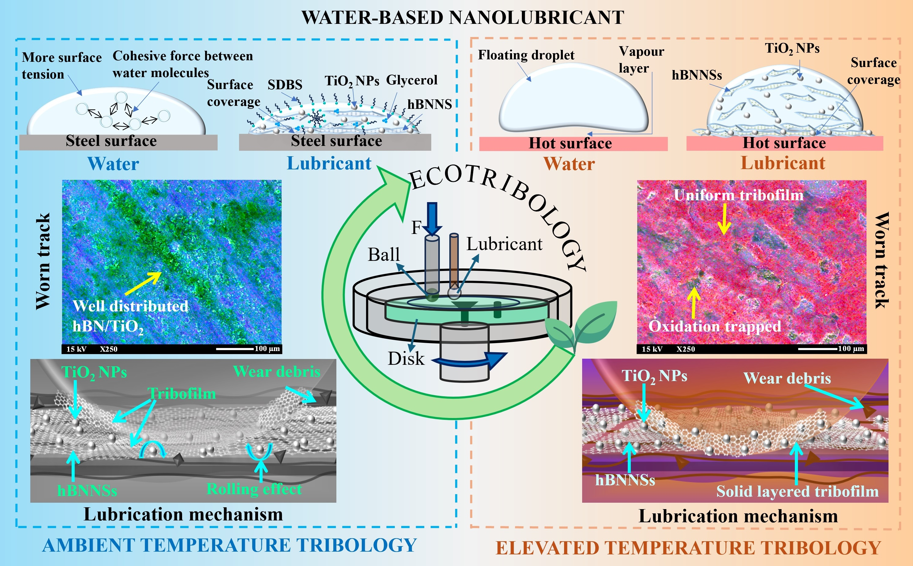 Ambient to Elevated Temperature: Ecotribology of Water-Based Lubricants Incorporating hBN/TiO2 Nanoadditives