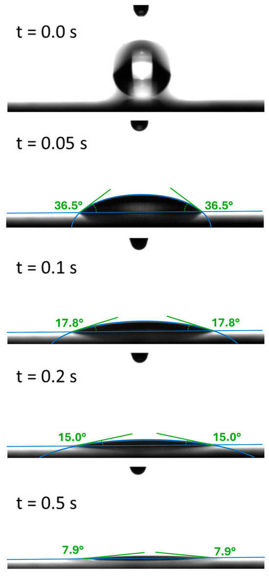 A sequence of five obtained images is depicted in Figure 2. The drop in the center of the images rapidly wets the steel surface underneath; after t = 0.5 s, a contact angle of less than 10° is reached.