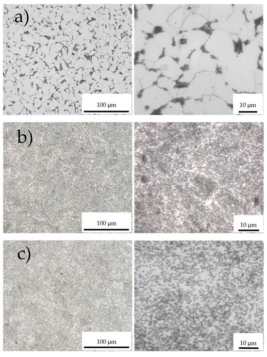 Figure 3 shows the microstructures of the steel surfaces obtained by optical microscopy. The low-carbon steel with Ceq 0.24 has mainly a ferrite phase with some pearlite grains (dark phase) at the grain boundaries (Figure 3a), while the sample with medium carbon with a Ceq of 0.79 has a completely lamellar pearlite structure (Figure 3b) as it processes the pearlite carbon content (0.77 to 0.8%) according to the Fe-C phase diagram [21]. The specimen with high-carbon steel exhibits a relatively spheroidal cementite typical of tempered martensite embedded in a ferrite matrix (Figure 3c) [22].
