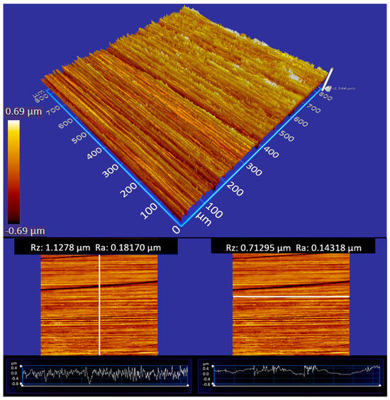 The surface treatment by grinding led to a significantly anisotropic surface topography. The roughness perpendicular for 250 grit is about Rz = 1.13 µm and Ra = 0.18 µm and parallel Rz = 0.71 µm and Ra = 0.14 µm. In particular, the difference is clearly seen in the profiles depicted in the bottom of Figure 4. The roughness values of the grinded samples are therefore all in the range of the milled surface and can be adequately compared with milled samples in order to subsequently check the contact angles of the tested lubricants on the ground specimens.