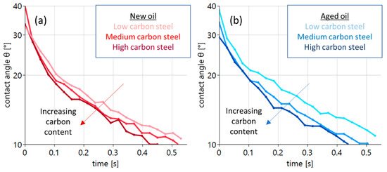 The role of oil aging can be described in a quite simple way. Only in the case of the low-carbon steel surface can a significant difference in wetting with new and aged oil be detected, as shown in Figure 7a. Here, wetting of the aged oil is considerably worse compared to the new oil. In the case of the medium- and high-carbon steels, the curves are basically indistinguishable.