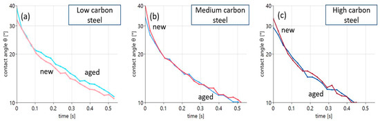 Figure 7. Contact angle evolution for new and aged oil on steel substrates with varying carbon content: (a) low carbon steel, (b) medium carbon steel, (c) high carbon steel.