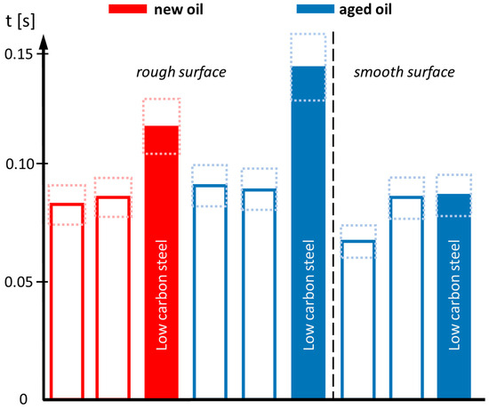 The bar chart allows an illustrative comparison of the wetting process. In the case of a homogeneous steel surface texture, referring to the medium and high carbon contents, quick wetting is always found. The time to reach a contact angle of 20° is smaller than t = 0.1 s (open bars). For inhomogeneous steel textures, in the case of the low-carbon steel, an increase in the wetting time is found, which is most pronounced in the case of the aged oil. Wetting of aged oil at inhomogeneous, rough steel surfaces is dramatically suppressed, leading to an increase in the considered wetting time by 50–70%. For applications in electrical drives with exceptionally high rotation speed, the limited wetting in the case of the aged oil might be critical, especially, if the used metallic components do not exhibit the right texture or surface finish.