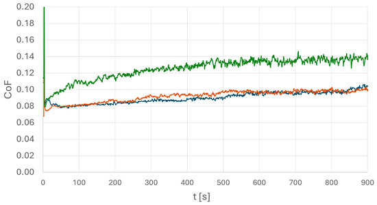 Figure 9. Coefficient of friction of a tribocontact of a 100Cr6 ball on the above-presented steel surfaces using oscillation tribometry. Aged PAO was used as lubricant. The diagram displays surfaces of high-carbon steel (blue), medium-carbon steel (brown), and the inhomogeneous low-carbon steel (green). The green curve exhibits a significantly different behavior.