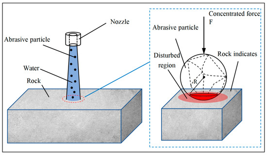 - The acceleration and deceleration mechanism of abrasive particles was studied by applying high-pressure water jet theory, and a mathematical calculation model for the velocity change during the whole process of abrasive particle impact was established. Based on cavity expansion theory, the mechanism of single abrasive particles impacting rocks was studied, and a mathematical model for the radius of each expansion area was established. Knowledge of contact mechanics and rock mechanics was used to study the elastic contact force of single abrasive particles colliding with rocks, and the concentrated force acting on the abrasive particles and the maximum compressive stress on the rock were obtained. On the basis of the above, a mathematical model of the rock-crushing removal conditions by abrasive water jet impact was established, and the parameter thresholds of the rock-crushing removal conditions by jets were obtained.