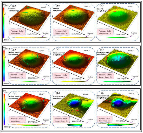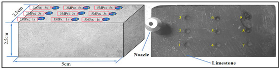 - Based on the equipment test conditions and the rock-related parameters, erosion of the rock surface at 2 MPa, 3 MPa, and 5 MPa pressure for different time periods was carried out by replacing the 2.7 MPa pressure calculated by the mathematical model with the 3 MPa pressure used as the benchmark for limestone crushing removal. The results of the study showed that, when the pressure was 2 MPa, no significant erosion pit damage was formed on the limestone surface, and a smooth morphology due to wear was present only in the impact area; meanwhile, the wear amount or depth did not change significantly with a continuous increase in the erosion time. When the pressure is 3 MPa, erosion pit damage begins to occur on the limestone surface, and a broken scratch morphology due to crushing removal was present in the impact area. Moreover, there was a significant change in the depth of the erosion pits with the continued increase in the erosion time, indicating that, under these pressure conditions, the jet can cause the erosion of limestone, which is more obvious when the pressure is 5 MPa. In summary, the impact rock-breaking effect in the experiment was consistent with the corresponding relationship between the test pressure and the theoretical pressure, and the error between the test reference pressure and the theoretical pressure was within reasonable limits, which confirms that the mathematical model of the rock-crushing removal conditions has good accuracy.