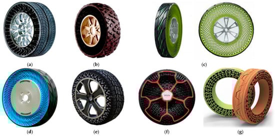 NPT replaces the inflation pressure of the tire with an elastic supporting structure. The integrated tire–rim design is adopted. The vibration is reduced and the ground bump energy is absorbed by the deformation of the rim and the elastic spoke. The concept was first proposed by the American engineer Brian Russell and was initially applied to mountain bike tires. In 2005, Michelin introduced the Tweel NPT (Figure 1a), while the U.S. company Cooper Tire subsequently launched a honeycomb bionic tire (Figure 1b). In 2011, Bridgestone developed a radial spiral mesh NPT (Figure 1c) and introduced the second generation of NPT in 2013 (Figure 1d). In 2014, the BAIC Group launched a negative Poisson’s ratio NPT (Figure 1e), using a negative Poisson’s ratio microstructure material to improve impact resistance. In 2010s, Hankook launched the I-Flex tire (Figure 1f), which employed polyurethane material and irregular honeycomb structure to improve bearing capacity and elasticity; It unveiled the airless ‘I-Flex’ concept in 2015 (Figure 1g). In 2017, Goodyear developed thermoplastic NPTs using thermoplastic materials to simplify the production process. In addition, Nanjing University of Aeronautics and Astronautics developed the ‘mechanical elastic wheel (ME-wheel)’ using hinge-structure support to study its static stiffness and cornering characteristics [4,8,9,10].
