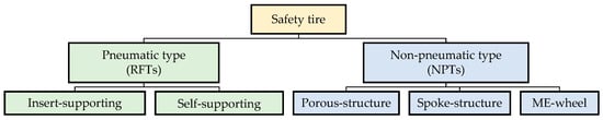 The classification of safety tires is shown in Figure 2. Safety tires can be divided into RFTs and NPTs. Common RFT designs include insert-supporting types, self-supporting types and self-sealing types. NPTs are classified by the structure of their supporting bodies, with common types including the spoke-type, porous-structure and ME-wheel designs. This chapter mainly summarizes the research progress of the ISRFT and the SSRFT, the porous-structure and spoke-structure of the NPTs and the structure of the ME wheels.