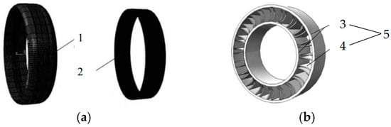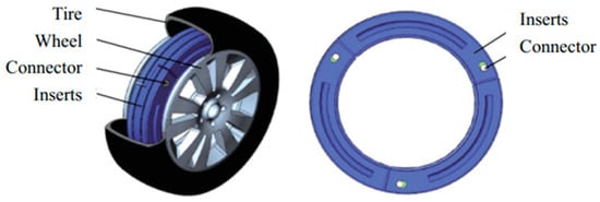 The design parameters of the inserts structure need to comprehensively consider the relationship with the tire profile, deformation and assembly. The determination of parameters such as inner diameter, outer diameter, section height and width are included as well. Some research also focuses on the heat dissipation and weight-reduction design of the inserts. Zang et al. [15] proposed the combined ISRFT structure, as shown in Figure 3. This structure adopted the standard rim design, added a heat dissipation groove to the outer surface of the inserts and designed the weight reduction groove on both sides. Its advantages are a simplified structure and reduced costs. Traditional inserts had problems such as large weight and large moment of inertia. Zang et al. [16] improved the overall performance of tire by topology optimization of the tire inserts body structure. They have achieved the goals of weight reduction, bearing performance optimization and design accuracy improvement. Liu et al. [17] studied different rubber formulations and structures. They focus on optimizing the inserts body performance, solving many problems during zero-pressure driving conditions and improving the overall performance and safety of tires.