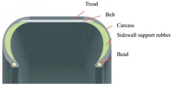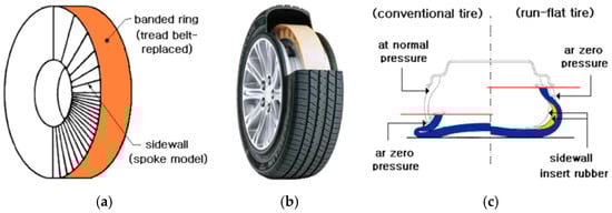 The development process of safety tires can be traced back to the beginning of the 20th century. The United States Goodyear Company first proposed and obtained the patent for the explosion-proof inner tube in 1934. In 1955, the double-chamber safety tire was introduced, and the insert-supporting run-flat tires (ISRFTs) were mass-produced in the middle and late 20th century. In 1973, Goodyear also proposed the self-supporting run-flat tire (SSRFT), which was mass-produced and loaded in 1994. In 1926, the U.S. Hutchinson Company provided an inserts body system for RFT for military vehicles. In 1997, Michelin introduced the MXV RFT, and in 1998, the PAX ISRFT was introduced for civil vehicles [4]. In 2002, Bridgestone Co., Ltd. partnered with German and Japanese enterprises to develop the inserts body, ring-type, run-flat system ‘Bridgestone Support Ring’ and released the third generation of self-supporting products in 2009. In recent years, the German Continental Group has also developed intelligent ISRFTs. The research on safety tires in China started relatively later. In the middle of the 20th century, Shenyang T-Rubber, Shuguang Rubber and other enterprises took the lead in research and development and realized the production of various types of RFTs [5]. Tianyi Tire, Guizhou Tire and other enterprises also launched special products. In the past two decades, China has increased investment in scientific research, focused on the improvement of tire structure and materials, and promoted the rapid development of the industry.