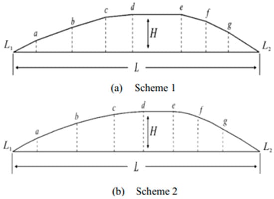 The main body of the tire usually adopts a radial tire structure to provide basic load-bearing and rolling functions. SIR is the key component of SSRFT. In the existing research, researchers used the geometric elements of the SIR as the core design variables and designed structural topology innovation or parameter optimization. In this way, the performance of the tire under zero-pressure and normal driving conditions is improved. To optimize sidewall inserts rubber in RFTs, Cho et al. [19] proposed a generalized multi-objective optimization method based on a genetic algorithm, with the SIR illustrated in Figure 5c as the optimization target. Differing from the ring types in Figure 5a,b, the sidewall-reinforcement type enhances sidewall stiffness to prevent collapse when the tire blowouts. The regions below the red line in Figure 5c respectively indicate the collapse degree of conventional tires and SSRFT after a blowout. This method was used to optimize the shape and stiffness of sidewall inserts. Specifically, it replaced time-consuming finite element analysis (FEA) with genetic evolution and integrated neural network technologies for research. On the basis of the 225/50 R17 98W radial tire, Lv et al. [20] added the design of insert rubber with hard texture on the sidewall. The outer side of the SIR was close to the inner wall of the sidewall deflection area in a crescent shape. Its upper and lower ends extended to the shoulder and bead area, respectively. Meanwhile, the inner side was close to the reinforced cord layer, which improved the sidewall strength. Lv et al. [21] studied the design parameters of the SIR, as shown in Figure 6. The maximum width L and the maximum thickness H affect the stiffness and contact characteristics of the tire. The change of L affects the overlap area of the SIR with the tread and the belt, which affects the bearing and stress distribution of the tire. The change of H is directly related to the deformation position and stress of the SIR. In conclusion, the structure and parameter design of the SIR influence SSRFTs’ mechanical characteristics under zero-pressure and rated pressure conditions. The characteristics involve radial stiffness, ground stress distribution, tread stress, etc. It is an important factor to balance the driving comfort, handling and zero-pressure driving ability of the vehicle.