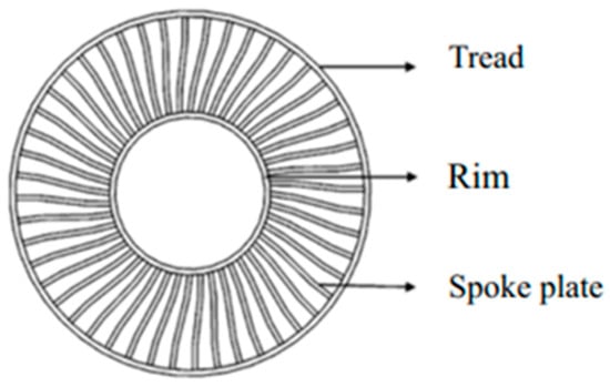 In addition to the above structural types, the spoke-plate structure has also attracted much attention. Xue et al. [52] proposed a new type of spoke-plate plastic tire and studied its grounding performance and mechanical characteristics under static load conditions. The tire combined polyurethane spokes with a rubber tread (Figure 14). Different from common spoke-type NPTs, this spoke-plate tire achieves load support and buffering through integral polyurethane spokes. It also shows unique advantages in terms of grounding performance and mechanical characteristics. It can achieve a more reasonable grounding imprint, a more uniform distribution of grounding pressure and higher radial stiffness.
