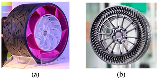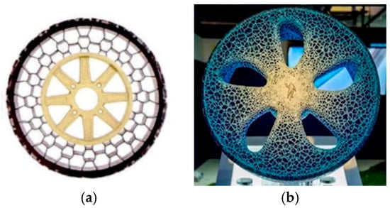 At present, many companies have achieved remarkable results in the field of NPTs with a porous structure. The Polymer Research Center in Madison, Wisconsin, USA has invented a hexagonal honeycomb tire (Figure 8a). The tire adopts a regular hexagonal pore structure and belongs to a typical honeycomb design in porous structures. In 2017, Michelin launched a concept tire, a 3D-printed biodegradable Vision tire (Figure 8b), which mimics the grid-like bionic porous structure of the alveoli.