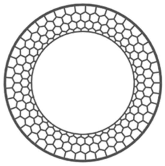The honeycomb structure is essentially a regular hexagonal porous form. The honeycomb hexagonal support structure designed according to the honeycomb principle (as shown in Figure 9), enables even distribution of tire mass and has high bearing capacity. The honeycomb unit transmits load and absorbs energy. By optimizing the configuration of the pneumatic tire cord layer, the honeycomb composite wheels can reduce the local damage and improve the impact resistance [26]. This structure is suitable for off-road vehicles, military applications and heavy machinery.
