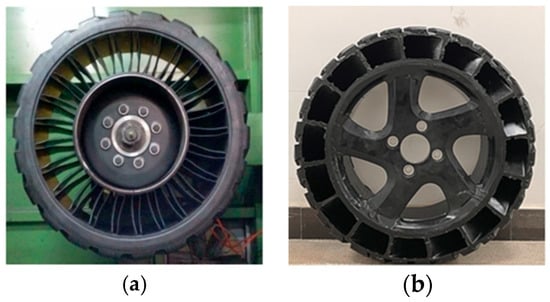 On the basis of research into basic spoke structures, some scholars have focused on innovative spoke design with bionics principles. Zhang et al. [38] designed a flexible-spoke bionic NPT. They were inspired by kangaroo hindlimb structures and then analyzed its mechanical characteristics under varying loads. Shuai et al. [39] proposed a V-spoke NPT (sample shown in Figure 11c), conducting simulations and tests to investigate how design parameters affect tire mechanics. Rugsaj et al. [40] developed an X-spoke NPT for military vehicles (Figure 11d), comparing its rolling characteristics and vertical stiffness.