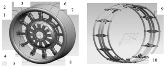Wang et al. [45] proposed a new ME wheel for a certain wheeled special vehicle. As shown in Figure 13, the wheel is primarily composed of a driving rubber ring, elastic ring, elastic ring clip, hub, return spring, pin and hinge, etc. To address the issue of repetitive design when adjusting structural dimensions or checking the strength of ME wheels, Yan et al. [46] developed a ME-wheel design platform. Based on parametric design and the Pro/E secondary development theory, the platform enables automatic structural dimension checking, 3D model generation and virtual assembly. They carried out the mechanical analysis of the wheel structure to clarify the classification of important structural parameters. At the same time, they described the establishment method of the top-down parameter constraint relationship.