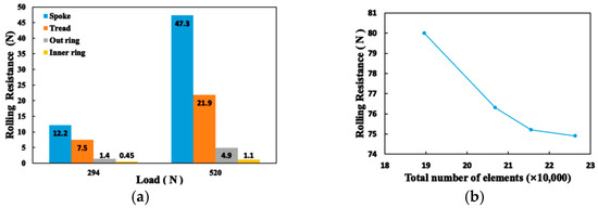 In recent years, mechanical characteristics have become the main entry point for scholars studying spoke-structure NPTs. Rugsaj et al. [34] established a finite element model (FEM) of NPTs with different spoke shapes. The model, based on Michelin’s Tweel 12N16.5 SSL all-terrain tire (Figure 11a), was applied to investigate how spoke geometry affected maximum stiffness and minimum local stress. Fu et al. [35] proposed a novel NPT with a flexible-spoke structure. Specifically, they employed thermo-mechanical sequential coupling to analyze the tire’s thermo-mechanical coupling characteristics under various working conditions. Fu et al. [36] predicted the fatigue life of a mesh soft-spoke NPT and analyzed how structural parameters impact fatigue life. In the research, the J-integral energy release rate crack propagation method was used. Ku et al. [37] developed a three-dimensional numerical analysis model for a new flexible-spoke NPT. By combining tire steady-state rolling theory, they conducted simulations of steady-state mechanical characteristics under multiple conditions, obtaining corresponding characteristic curves and laws.