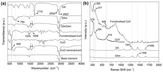 (a) FTIR spectra of OA/OLA = 1:2 grafted CuO NPs, oleic acid, oleylamine, oleic acid/oleylamine, grafted CuO nanolubricant, bare CuO NPs, and base lubricant. (b) Raman spectra of oleic acid, oleylamine, CuO NPs, and OA/OLA grafted CuO NPs.