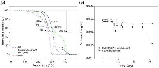 (a) TGA of OA/OAm = 1:2 grafted CuO NPs, OA, OAm, and OA/OAm; (b) UV–vis dispersion stability testing of functionalized and bare CuO nanolubricants.