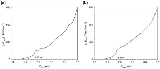 Tauc plots showed a small increase in band gap energy between the bare (1.60 eV, Figure 3a) and functionalized (1.62 eV, Figure 3b) CuO nanoparticles, likely due to the effect of the ligands in passivating surface traps and reducing agglomeration growth. These values of band gap energies are close to the reported values of CuO nanoparticles in the size range of 20–50 nm [30,32].
