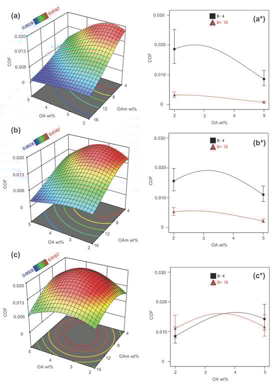 The regression model is represented by the 3D response surfaces and 2D interaction plots (Figure 4). These allowed visualization of the relationship between the experimental level of each variable and its effect on the response. At low and intermediate concentrations of CuO (0.04 and 0.055 wt%), increasing the percentage of OAm (B+) at most of the OA concentrations led to a significant reduction in the COF, compared to reducing the percentage of OAm. This is likely due to the important role of the OAm in initiating the acid–base complex reaction (ABC reaction) that provides a good environment of repulsive steric forces [11,13,45,54]. This steric stability can then decrease the attractive van der Waals force and prevent agglomeration that can adversely affect the tribological properties [8]. Under some other conditions of varying OA, OAm, and CuO, the friction properties of the lubricant are adversely affected. This can be attributed to the interaction at specific levels of ligand that can occur with nanoparticles, which leads to cross-agglomeration of nanoparticles or the interaction of ligands with lubricant molecules that can affect their viscosity, chemical, and thermal properties, and thus, the load-carrying capacity of the lubricant [53,55].