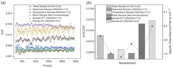 Figure 5a illustrates that the optimized, blank, and comparative samples demonstrated a significant reduction in the COF compared to the base oil, with an improvement ranging from 44.9% to 60.6%. These improvements were notably achieved under high-temperature conditions (75 °C) that simulate a dry friction scenario by the four-ball test. This suggests that CuO nanoparticles, whether functionalized with ligands (as in the optimized and comparative samples) or not (as in the blank sample), are effective in protecting surfaces under severe conditions by minimizing frictional energy losses.