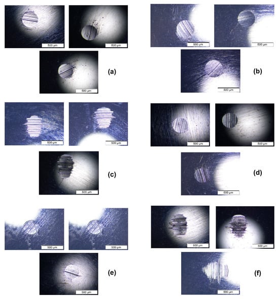 The microscopic examination of wear scar diameters on the three balls for each sample, shown in Figure 6, revealed severe grooves, scratches, and heterogeneous areas on the friction surfaces. These observations reflect the dry friction conditions characteristic of the four-ball test, where excessive asperity contact occurs due to lubricant thinning. While all samples exhibited some degree of surface roughness, the optimized, blank, and comparative samples (Figure 6a,b,d) displayed smoother wear scars with finer, tighter, and shallower, to some extent, abrasion marks compared to the base oil sample (Figure 6c). This suggests that, under certain conditions, the CuO nanolubricants—whether functionalized or not—can provide better surface protection and minimize abrasive damage.