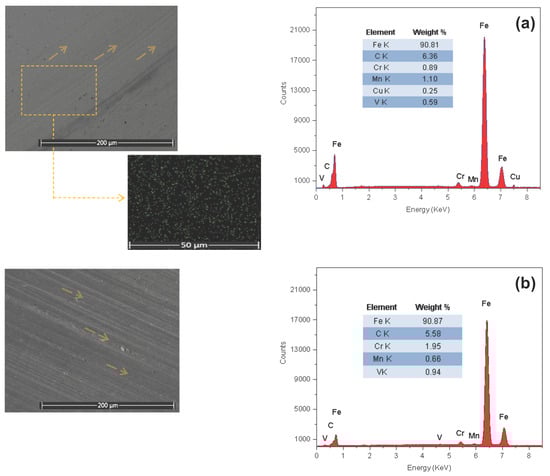 For SEM/EDX analysis (Figure 7), the micromorphology for the lower ball for both optimized and base samples showed a relatively similar pattern of abrasion scratches, small cracks, and merging pits. However, in the case of the optimized sample, reduced scratching gave a smoother surface, in line with the friction and WSD results. The promotion in friction properties of the CuO nanolubricant is ascribed to the formation of low-resistance lubricant films (tribo-film generation), as discussed in our previous study [22]. This was confirmed through EDX surface mapping. Here, white spots on the ball surface showed signals of Cu, besides the elements of Fe, C, Cr, Mn, and V, coming from the steel balls (Figure 7a). Such tribo-films yield reduced metal–metal contact, which can be linked to the reduced COF and wear rates observed herein [16,17,57,58].