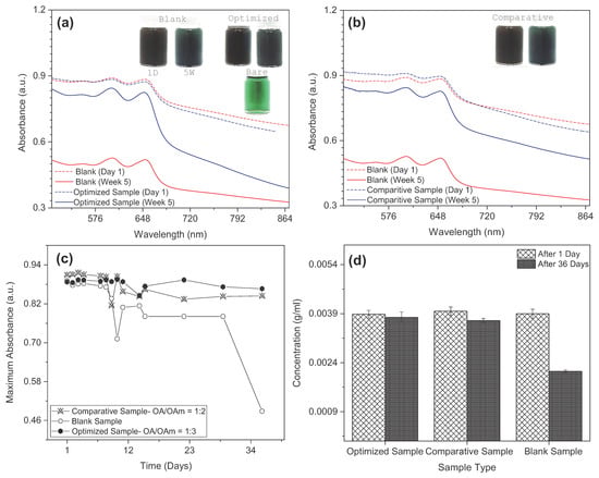UV–vis and visual observation analysis of the CuO nanolubricant functionalized with the OA/OAm ligand pair in comparison with the blank sample without any functionalization, over a five-week period. (a) UV spectra of optimized sample (OA/OAm of 1:3). (b) UV spectra of the comparative sample (OA/OAm of 1:2). (c) The maximum absorbance value of the three samples over 36 days. (d) UV–vis dispersion stability evaluation for the loss of concentration.