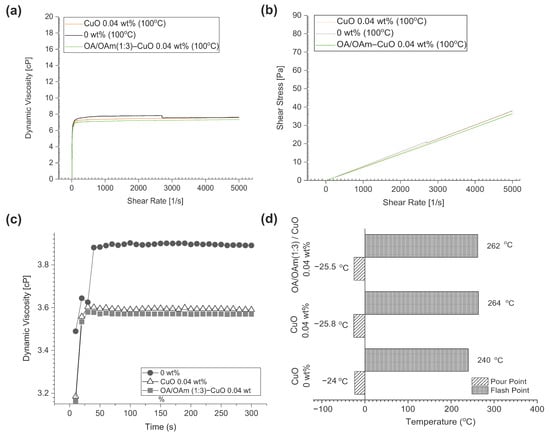 Rheological and thermophysical analysis of the CuO nanolubricant functionalized with OA/OAm ligand pair in comparison with the blank sample without any functionalization and the bare sample without nano additives. (a) Shear rate vs. dynamic viscosity. (b) Shear rate vs. shear stress. (c) HTHS viscosity (at 150 °C). (d) Flash and pour points.